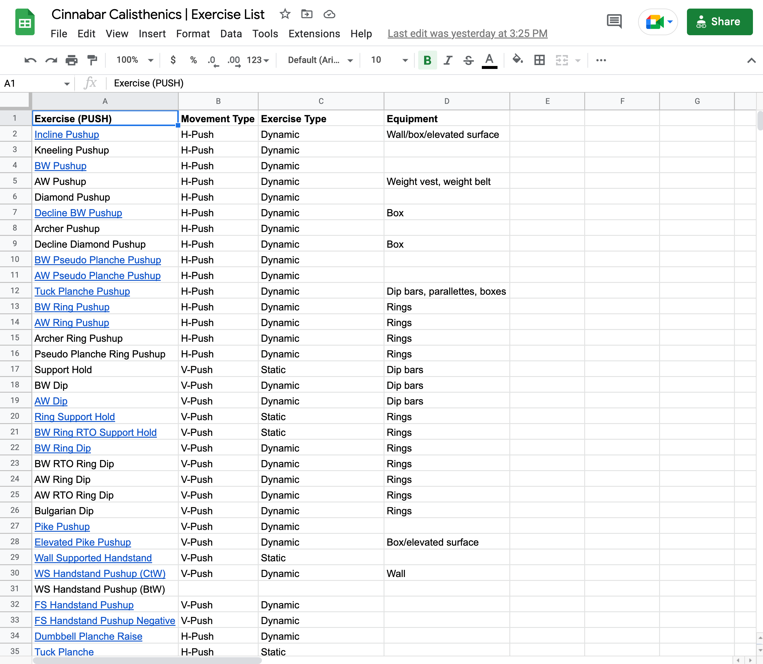 Each exercise is grouped by movement type: